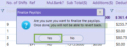 (n) A confirmation message is displayed to confirm the user intends to finalize the payslips. Click on the ‘Yes’ button.