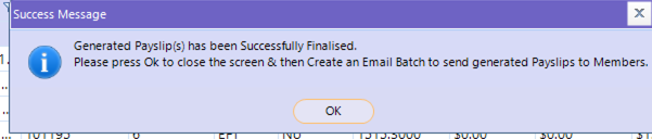 (P) The user is then notified that the payslips have been successfully finalized and instructed to close the screen and create an email batch to send payslips to members, as can be seen below.