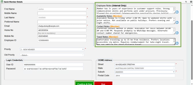 - Employee Notes (Internal Only): These notes are for internal use by staff and are not visible to members. Use this section to record important internal information about the employee, such as performance feedback, special instructions, or any operational details relevant to shift management.