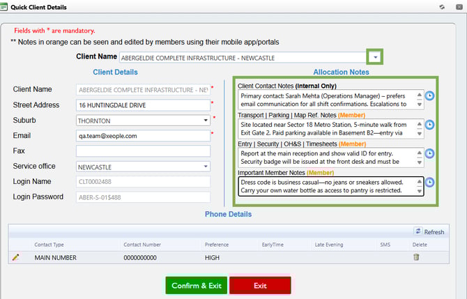 - Client Contact Notes (Internal Only): These notes are for internal use by staff and are not visible to members or clients. Use this section to record key client contact details, communication history, escalation points, or any sensitive information related to client interactions.