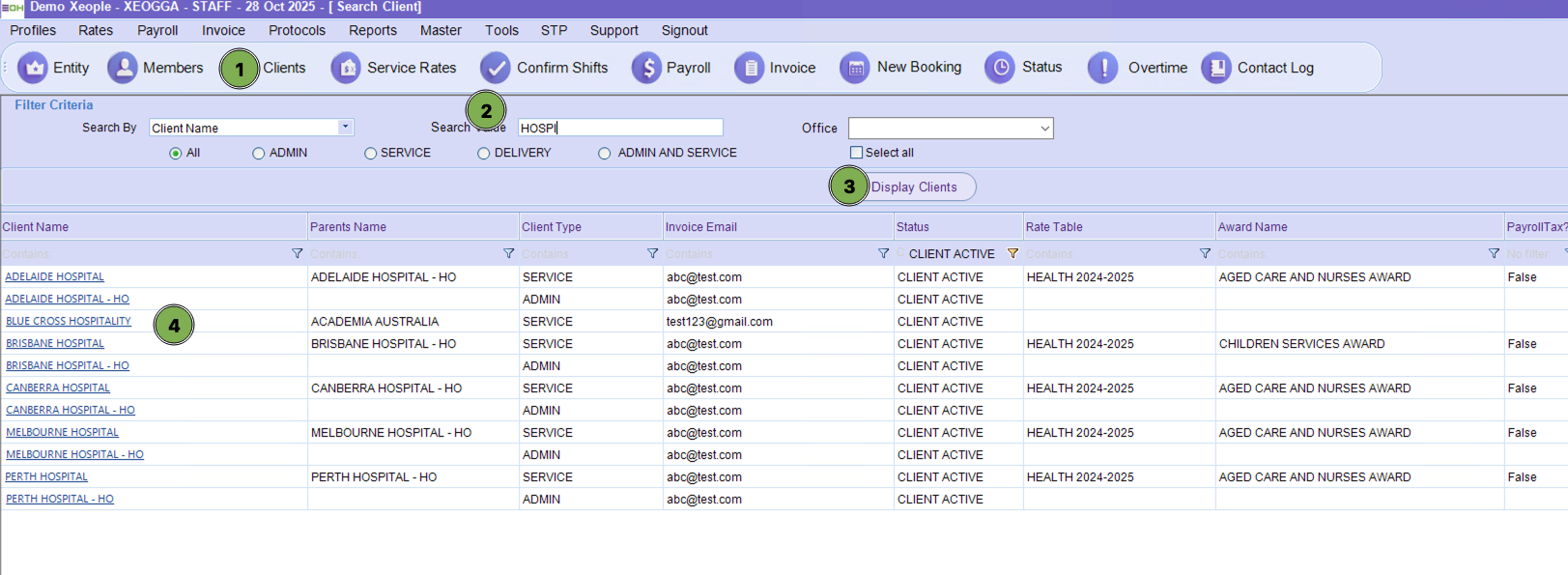 - Within the Finance Portal, search for the Client Location and select the Client name to open the profile.