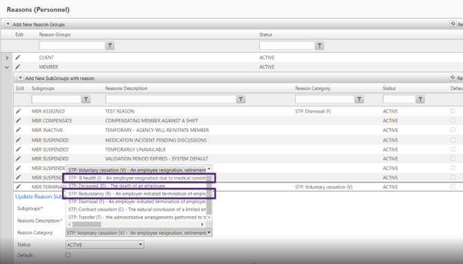 In the Reasons (Personnel) Master of the Staff portal application, the Cessation Type Code for the Lump Sum payments are mapped from the Subgroups 'MBR TERMINATED' in the Reason Category, and the Reason Category selected can be either Ill health (I), or Redundancy (R).