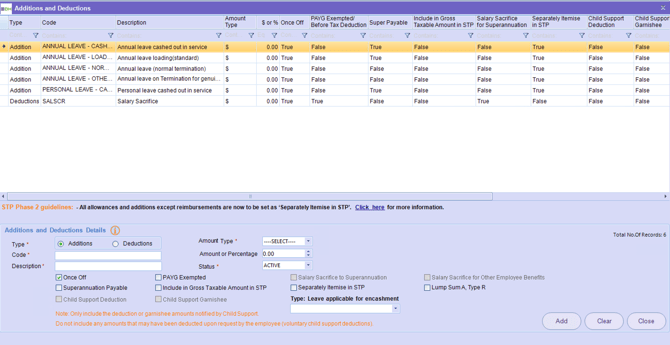 Separately Itemise in STP: If ticked this will show the Addition/Deductions separately on the end-of-year submissions to ATO.