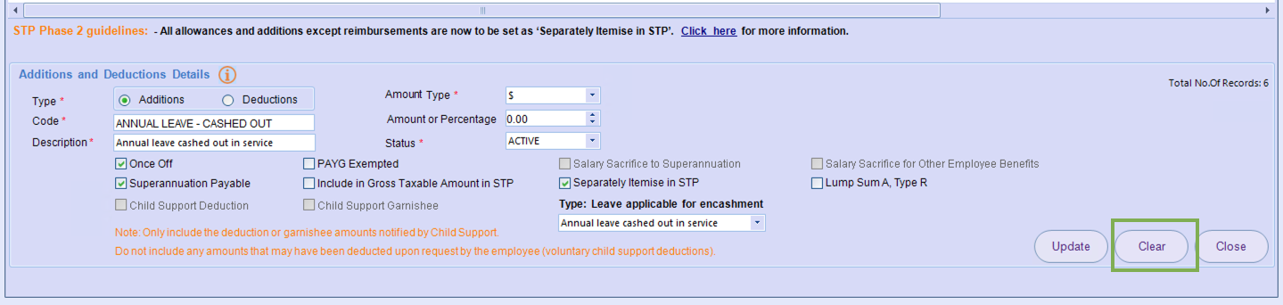 If you have selected an Addition/Deduction to edit but no longer need to you can click on the Clear option and it will reset the form.