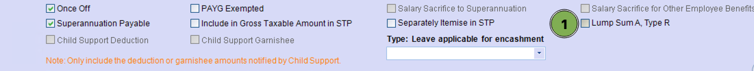 In case you are reporting the Lump Sum amount in your STP, you need to select the Addition as Lump Sum Code A Type R in the Addition and Deduction master screen and map the addition in the Single Touch Payroll Allowance Codes Mapping screen.