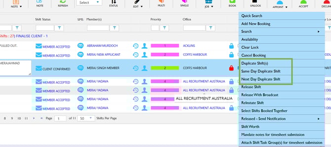 To create a duplicate shift, simply right-click on the desired shift and choose one of the following options: