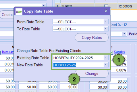 Within the pop-up screen select the old rate table and the new rate table from the drop down listthen click Change