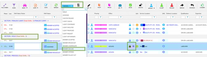 - Use the checkbox to select the shift, then choose the required status (Member Decline) from the Status drop‑down menu.