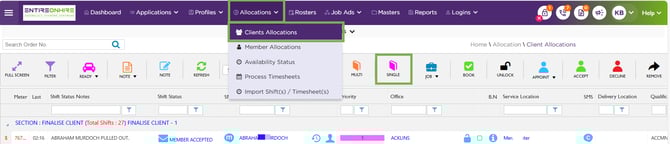 - In the Allocations screen, navigate to the quick access toolbar and select SINGLE to enter a single shift.