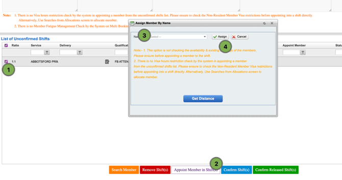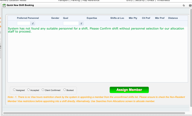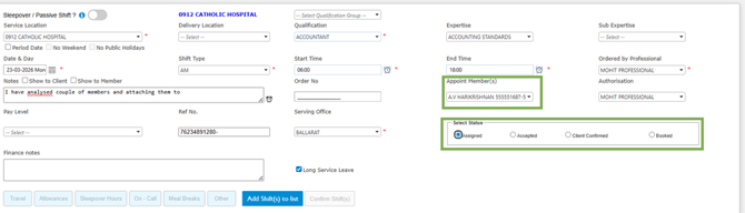 - Appoint Member in Shift(s): Allows you to manually select and appoint a member straight into the shift. When using this option, you will also be asked to choose the shift status (Assigned, Accepted, Client Confirmed, or Booked). Use this when you already know exactly who should be placed.