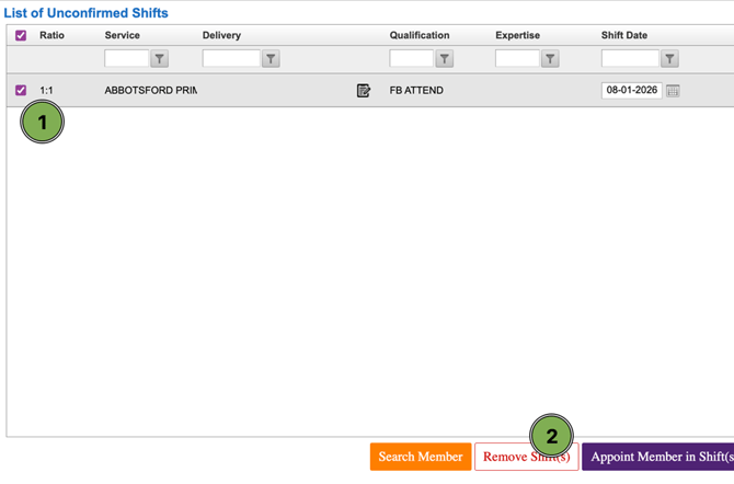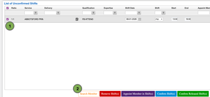 - Search Member: Use this to look up suitable members for a selected shift.