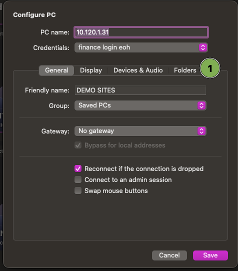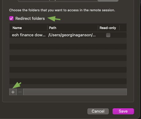 Now, choose the folders that you want to access in the remote session. Click Folders and check Redirect Folders.