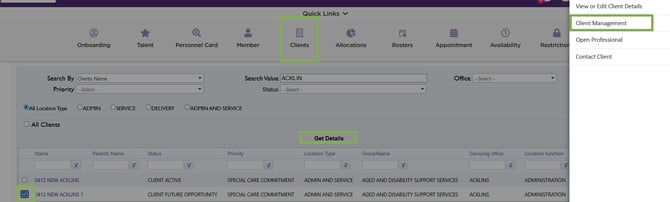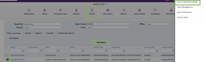 - From the search results, select the client profile and choose View and Edit Client Details from the right-hand panel.