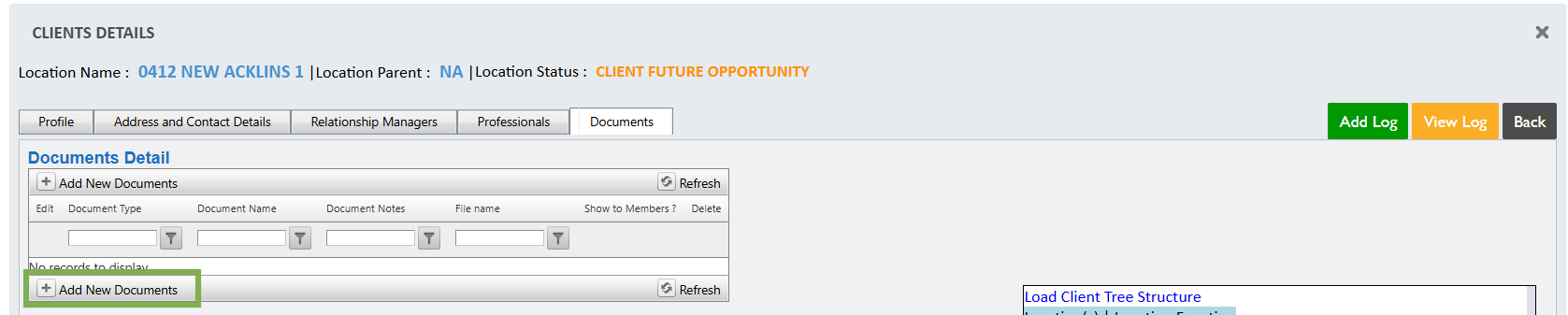 - This action opens the client details page in a new window. Select the Documents tab to continue.