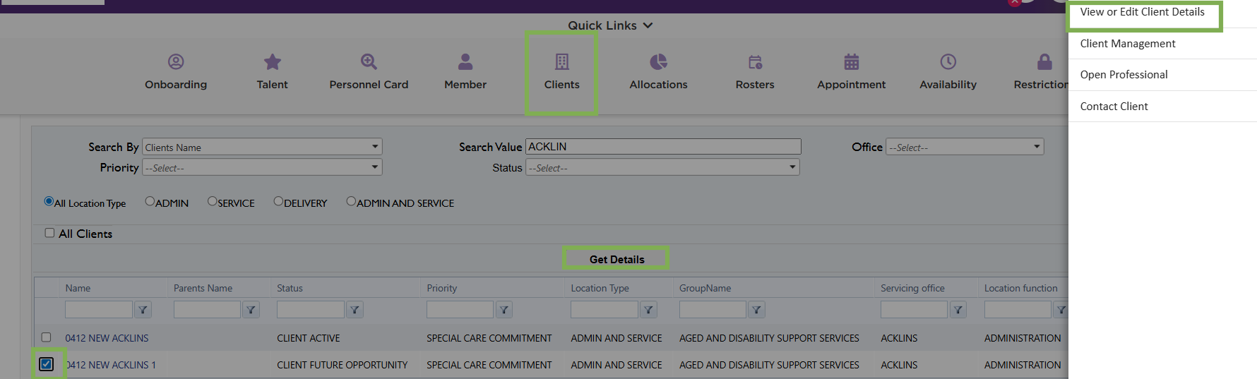 - From the search results, select the client profile and choose View and Edit Client Details from the right-hand panel.