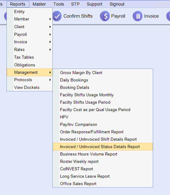 Reports > Management > Invoice/Uninvoiced Status Details