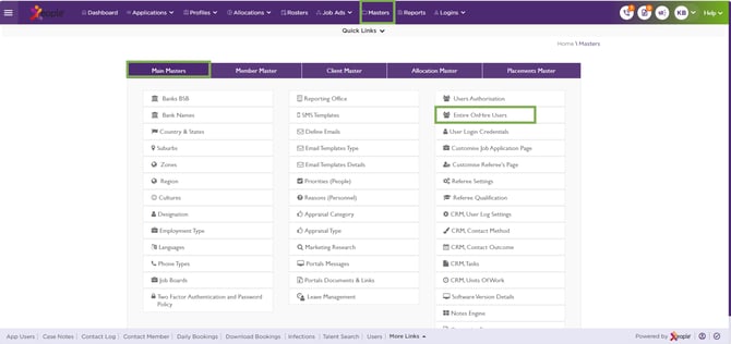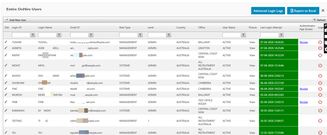 The Internal Users master allows you to view and manage all internal staff accounts, including their login ID, login name, contact details, role type, level, location, login status, authenticator app access, etc. It also lets you create new users and log out existing users.