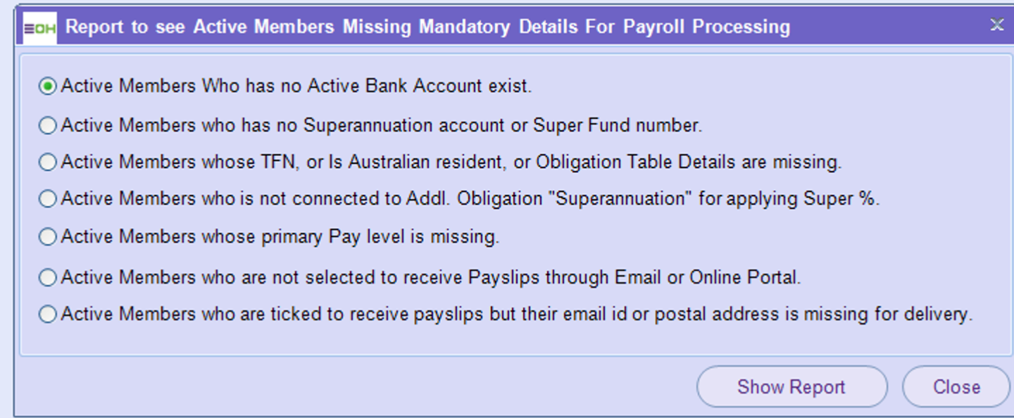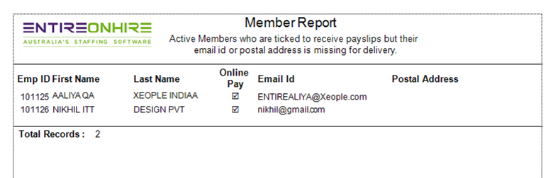 · Active Members who are ticked to receive payslips but are missing Email ID/Postal Address