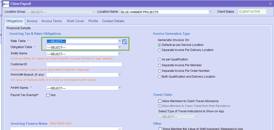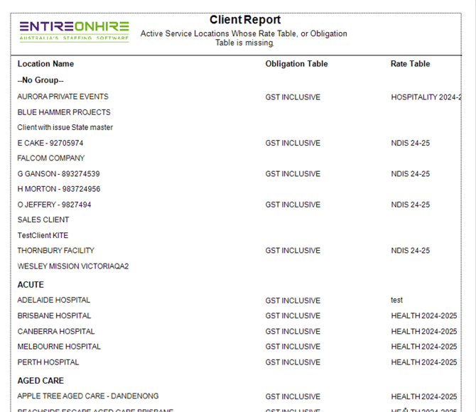 · Active Service locations whose Rate Table or Obligation Table are Missing