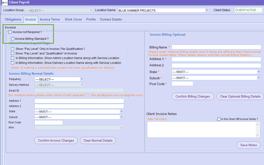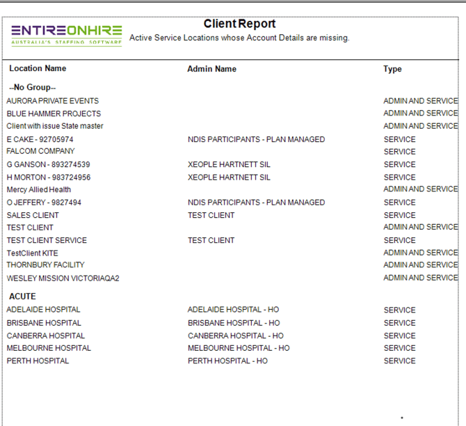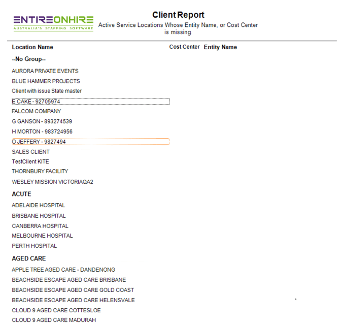 · Active Service locations whose Entity Name or Cost Centre is missing
