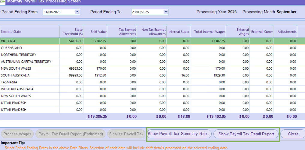 Victoria has total internal wages of $17,302.75 with a state threshold of $54,166. Payroll tax rate is 4.85%, though no tax is payable yet as the threshold has not been exceeded.