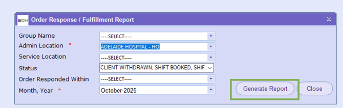 The Order Response / Fulfillment Report provides visibility into how efficiently client shift requests (orders) are being actioned and fulfilled within a selected time frame.