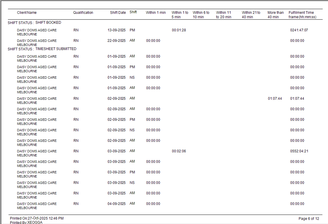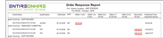 | Within 1 min / Within 1 to 5 min / Within 6 to 10 min / Within 11 to 20 min / Within 21 to 40 min / More than 40 min | These columns categorise how quickly each order was responded to. The time difference is calculated between when the client created the shift and when the admin fulfilled or booked it. A time stamp appears in the relevant column (e.g. “00:01:28” indicates a 1 minute, 28 second response). |