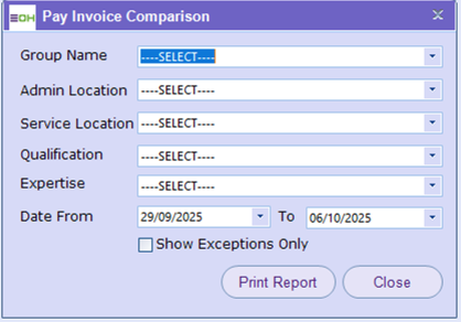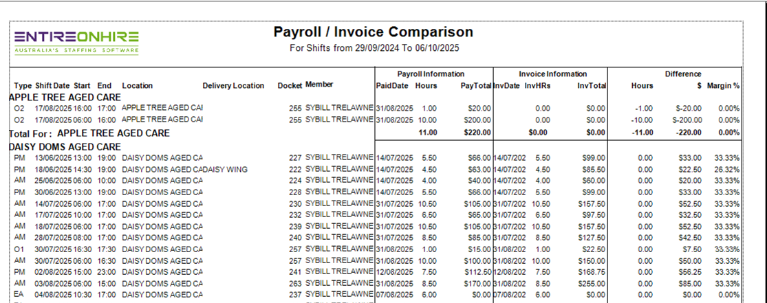 The Pay/Invoice Comparison report compares Payroll and Invoice figures per Service Location. Then provides a calculation of difference in Hours, Amount and Percentage of Margins per shift and Total sum for the date range selected.