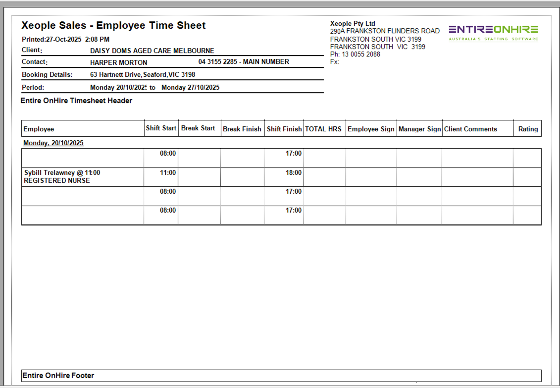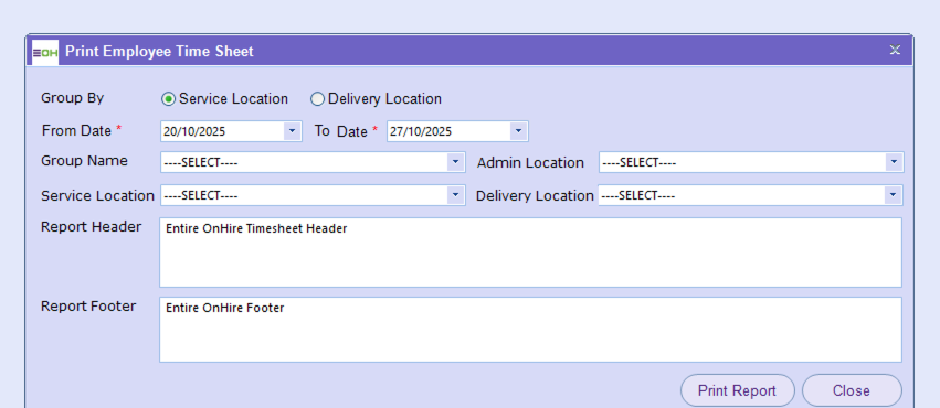 | Report Header | Lets you customise the top section of the printed timesheet (e.g. include “Entire OnHire Timesheet Header”). |