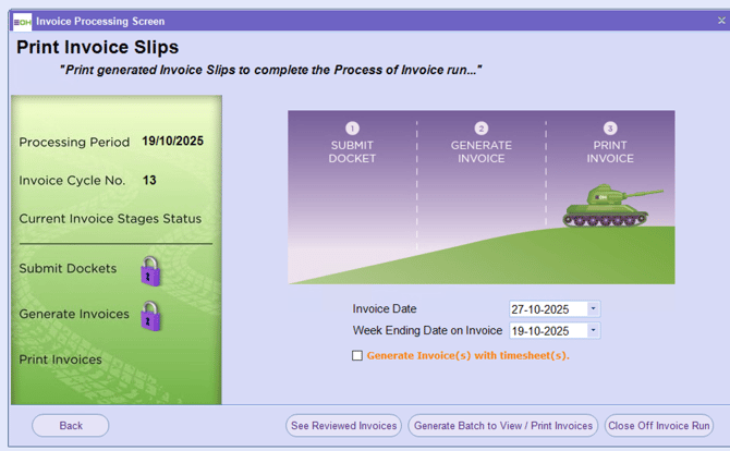 Hank the Tank now indicates that we are at the Print Invoice step of the invoice run. This step is responsible for generating the batch of emails to be sent to clients with attached invoices, and also the batch of paper-based invoices to be printed, where clients have opted for posted invoices.