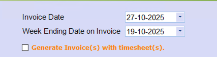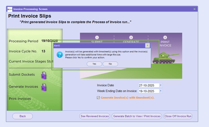 As well as generate the dockets/timesheets to every invoice within that invoicing batch - Please note if you select this it will take a little longer to generate.