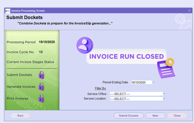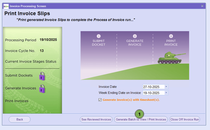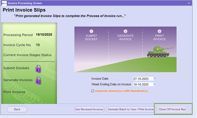Then click the ‘Close Off Invoice Run’ button to mark the invoice run as complete.