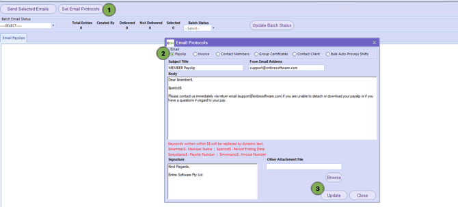 The email sender, subject, body text, and email signature must all be defined for the email that the payslip is attached to.