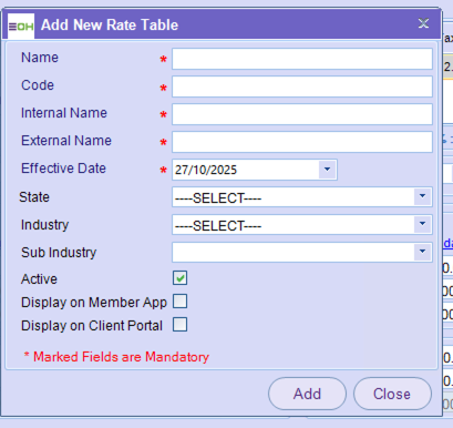 Add Rate Table - Select this function to add in a new rate table. Rate tables must exist in Entire OnHire prior to adding in any rate detail