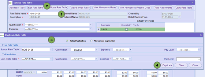 You can use this function to duplicate these rates from one rate table to another rather than create the rates in both rate tables. Please note: this function also supports the duplication of allowance rates. NB: this function is designed for singular duplications ( 1 to 1 ). You cannot use this function for multiple duplications ( 1 to all )
