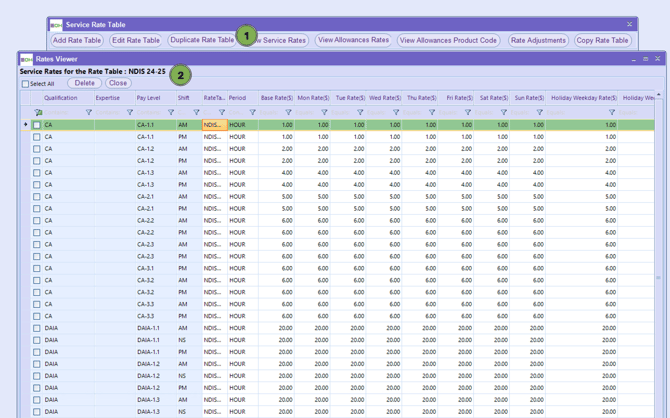 Duplicate Rate Table - Select this function to duplicate rates within one rate table into another rate table. This function allows you to choose what qualification, expertise and pay level you wish to duplicate into another rate table. EG: Registered Nurse pay rates with an expertise of ICU are common across two of your rate tables.