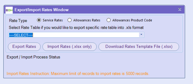 Users are able to export specific service ( pay and charge ) rates or all service rates. The export is a .csv file and it is important for the importing process that users make no changes ( other than the rate values themselves ) to the exported file. This capability is particularly handy when you are preparing new rates across the board.