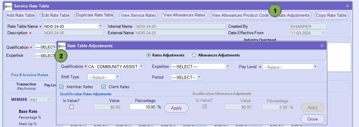 - Rate Adjustments - Select this function to make an adjustment ( either $ or % ) to pay, charge or allowance rates within a particular rate table. Please note: this adjustment function can only be applied to a singular qualification and Pay Level. It cannot be used to adjust all rates for all qualifications and pay levels within a rate table