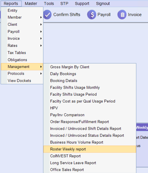 Reports > Management > Roster Weekly Report