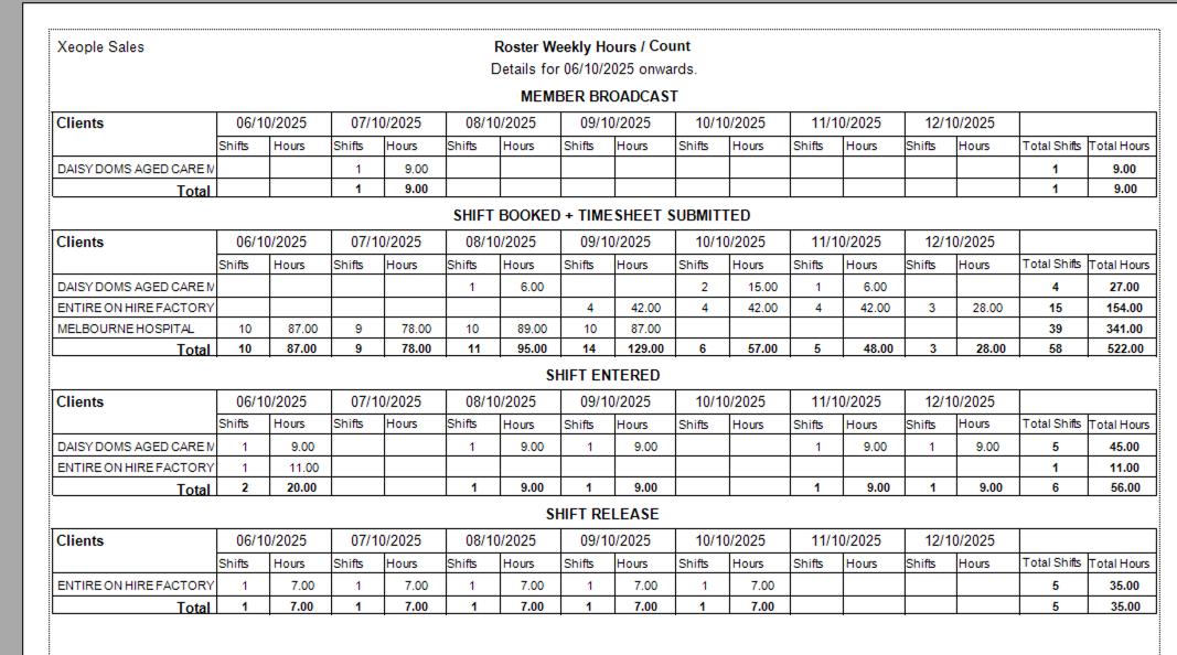 | Total Shifts / Total Hours | Weekly totals for released shifts per client. |