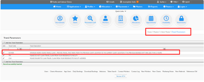 Go to Masters → Client Master → Travel Parameters (as shown in the below screenshot). Click Add New Travel Parameter, fill in the Travel Code & Travel Description and save the details.