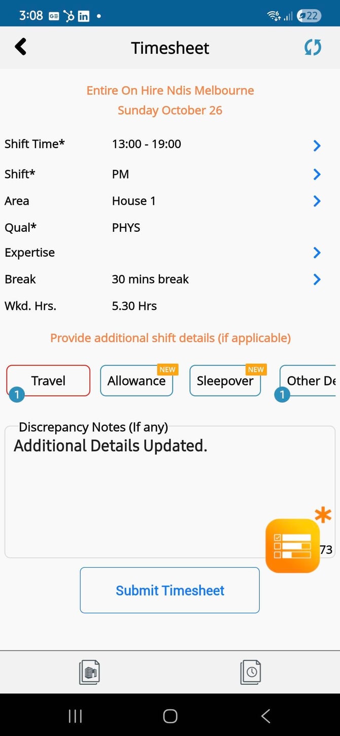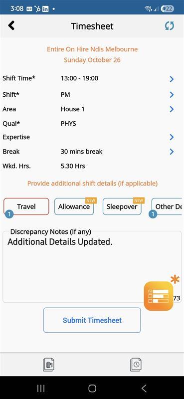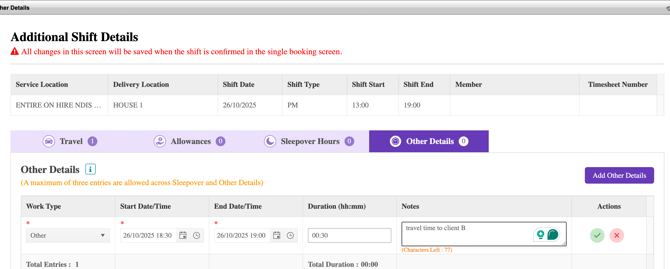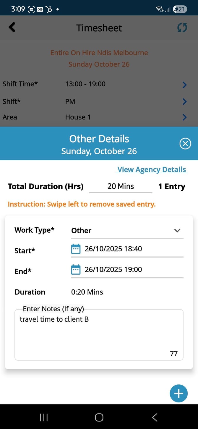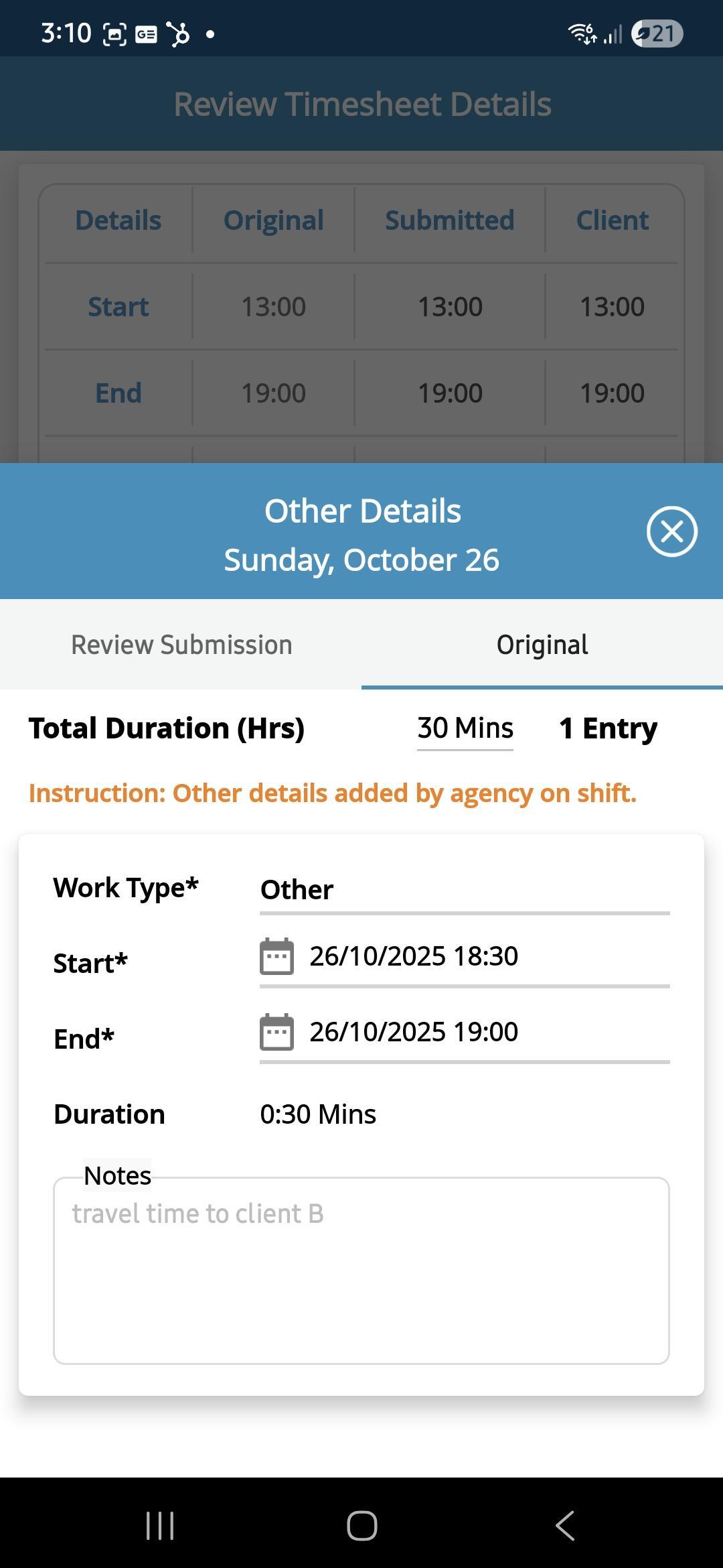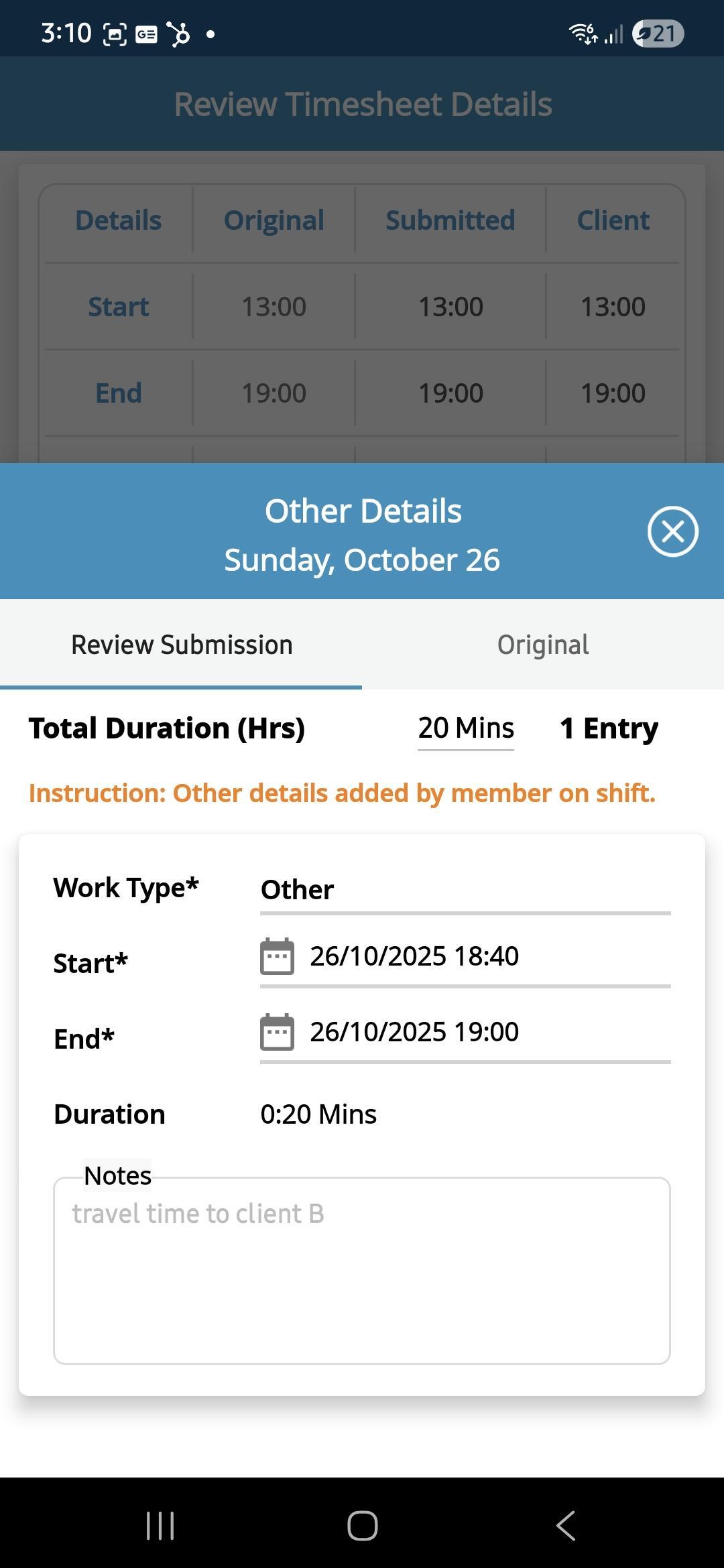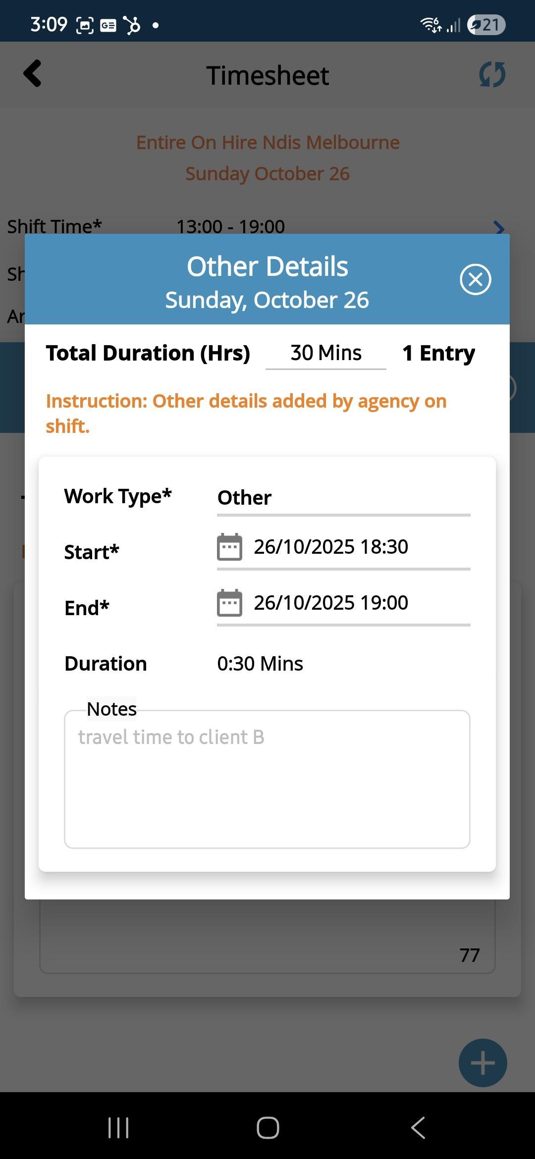 Travel Time - Ensure the shift at the end includes the travel time - enter as "other"