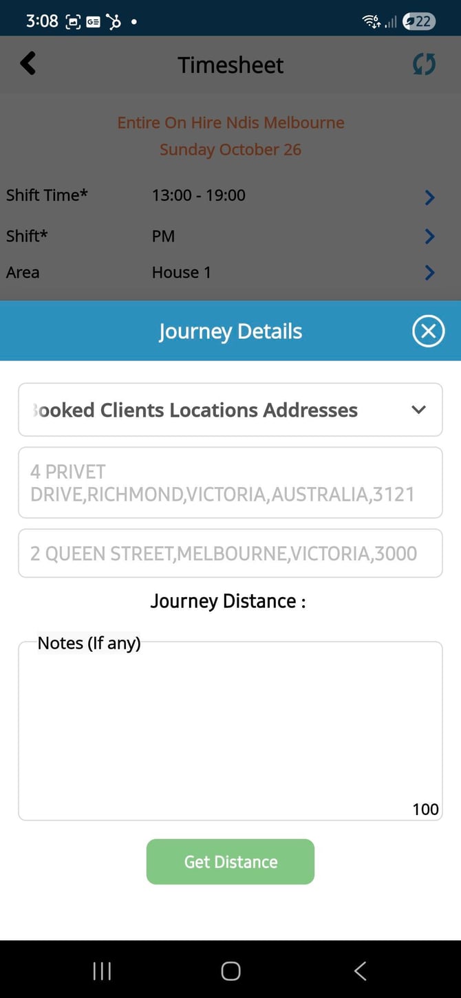 I will enter journey address - This involves you entering your starting and end address and then when you click get distance this integrates with your Google API and gets the total amount of km.