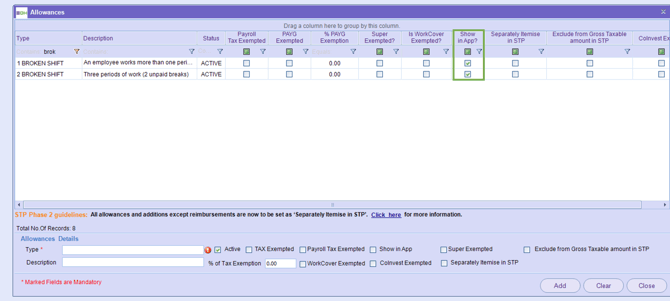 Ensure the Broken Shift Allowance is visible in the app.