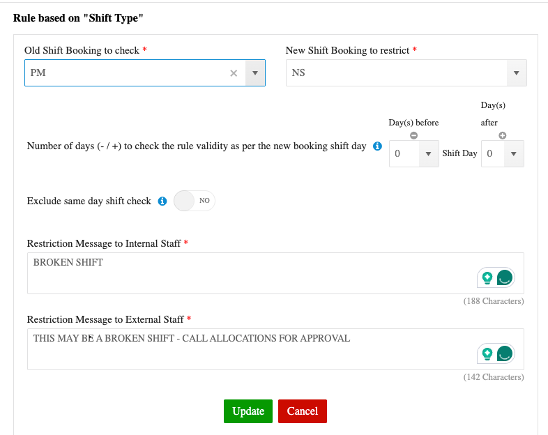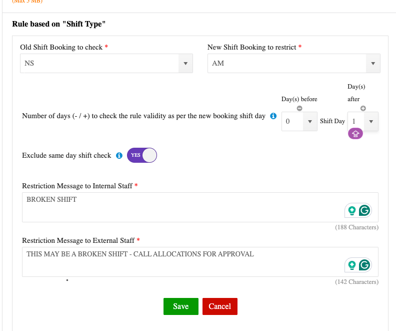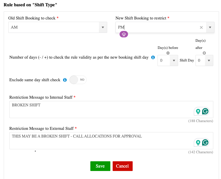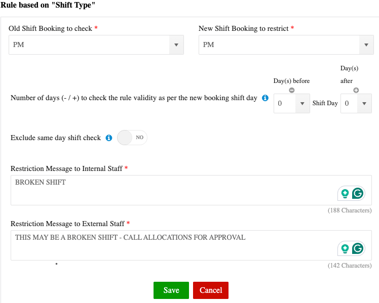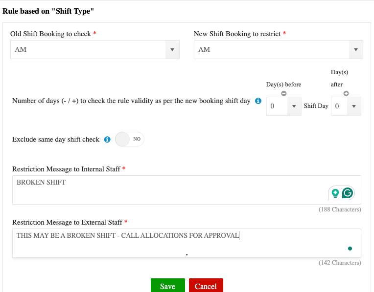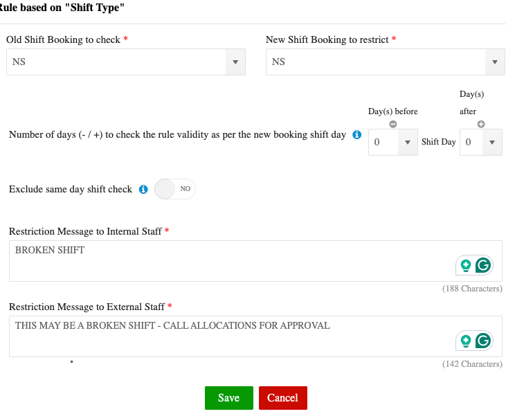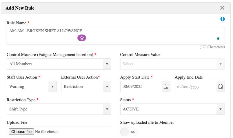 Configure fatigue management rules to block a member if a broken shift exceeds safe limits.