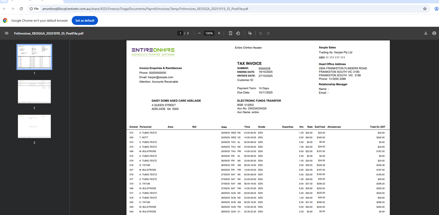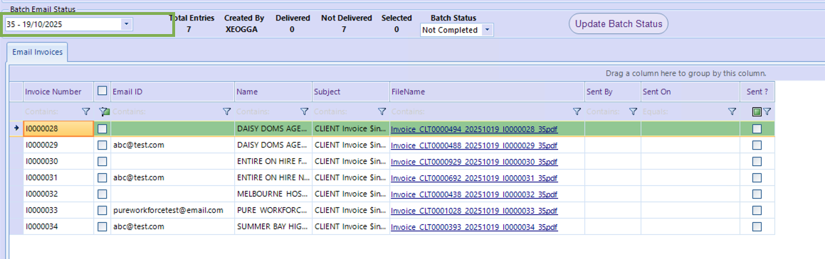 The invoice run has been successfully completed, and all invoices have been sent to clients using their preferred delivery methods. Invoices are now available for internal staff through the Finance Portal, for clients via the Client Portal, and for professionals within the Professionals App. Full invoice run details can also be reviewed using Entire OnHire’s reporting features.