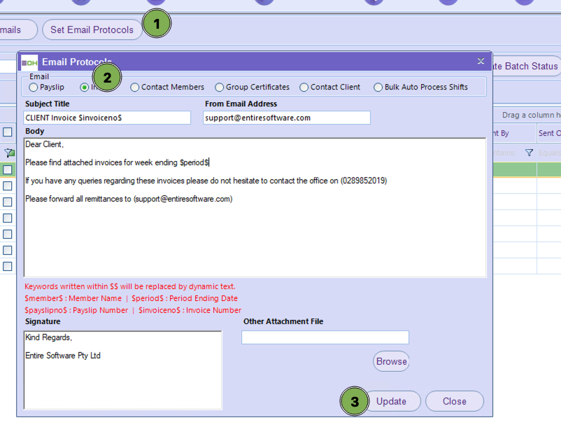 - Click on the ‘Set Email Protocols’ button to display the Email Protocols Screen, as displayed below. The Screen will default to displaying payslip text, so click on the ‘Invoice’ radio button. This shows the text that is displayed on every email that accompanies the invoices that are sent out. Use this screen to confirm that the email subject line and body text have been correctly set up. Update if necessary and click the ‘Update’ button. Once the text has been confirmed or updated, click on the ‘Close’ button.