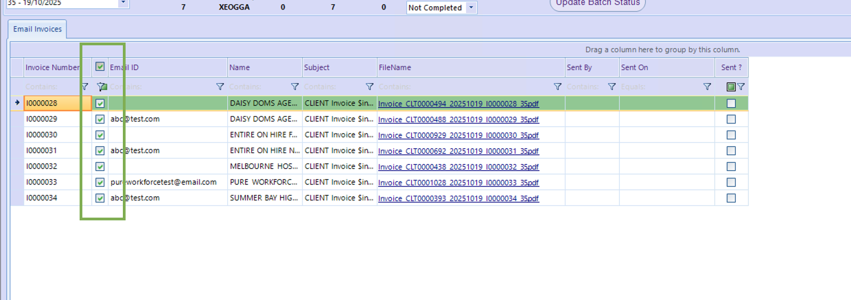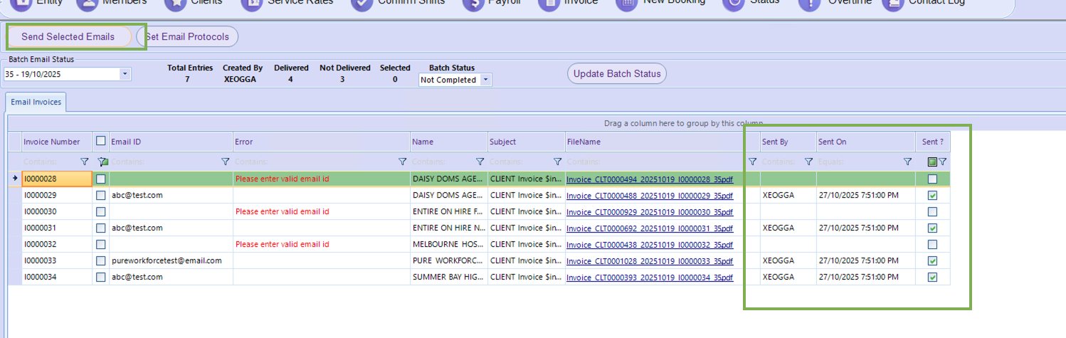 - Click on the ‘Send Selected Emails’ button to send the emails with attached invoices. The ‘Sent By’, ‘Sent On’ and ‘Sent?’ columns will then be populated to record that the emails have been sent.
