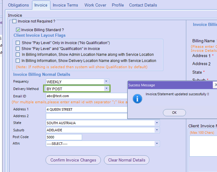 Now that the invoice run is complete, invoices need to be sent to clients. Clients can receive their invoices in three ways, via email, post or FTP (file transfer protocol). The way in which the client receives their invoice is defined on the Client Record. While there are three methods, most clients receive their invoices by email or by post.