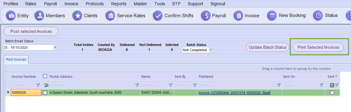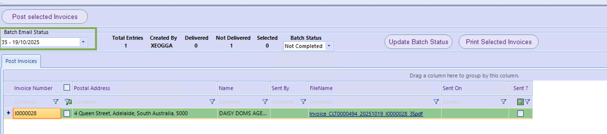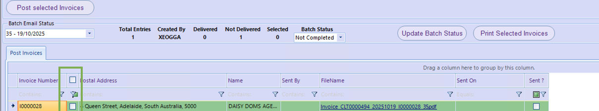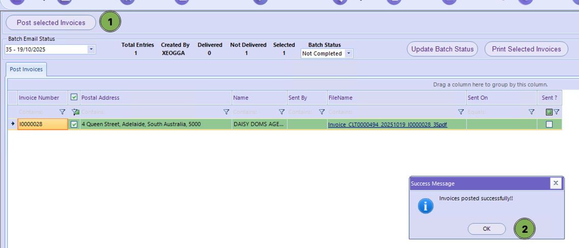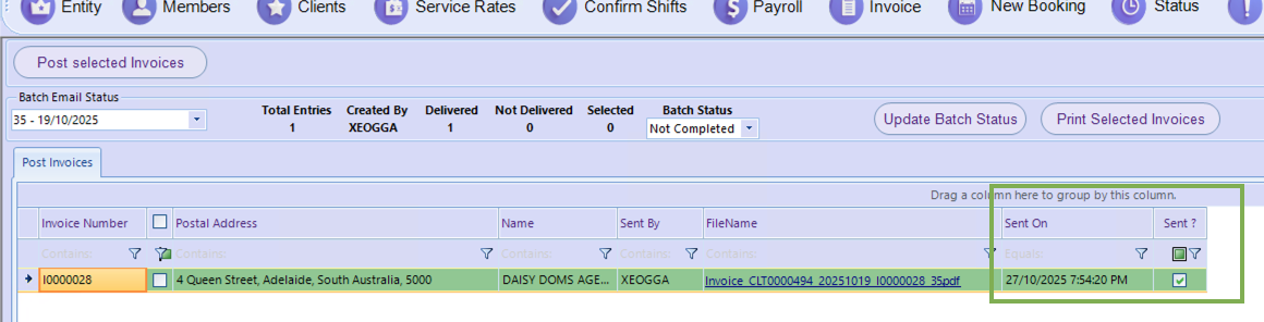 - Click on the ‘Post Selected Invoices’ button. A confirmation message is displayed. Click OK. The ‘Sent On’ and ‘Sent?’ columns will then be populated to record that the invoices have been posted, and the date/time they were posted.
